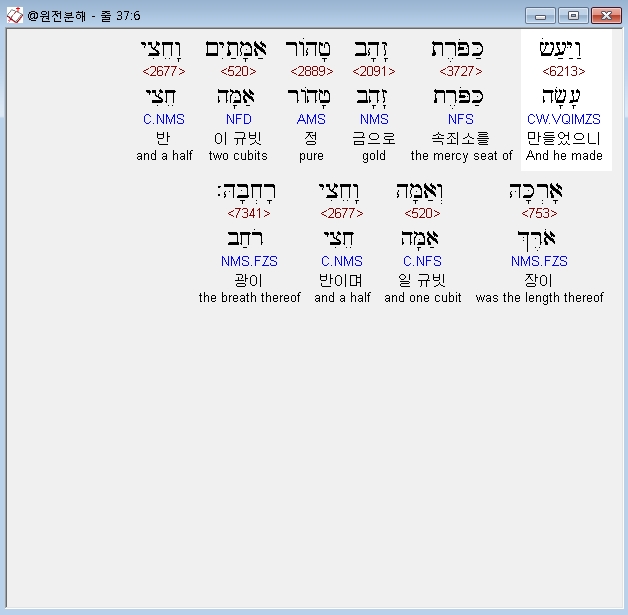 히브리어구약BHS,6 וַיַּעַשׂ כַּפֹּרֶת זָהָב טָהֹור אַמָּתַיִם וָחֵצִי אָרְכָּהּ וְאַמָּה וָחֵצִי רָחְבָּהּ׃