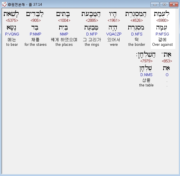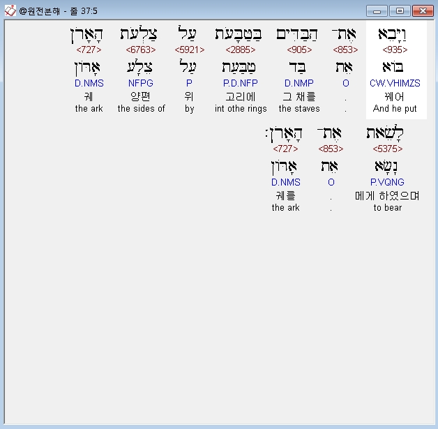 히브리어구약BHS,5 וַיָּבֵא אֶת־הַבַּדִּים בַּטַּבָּעֹת עַל צַלְעֹת הָאָרֹן לָשֵׂאת אֶת־הָאָרֹן׃