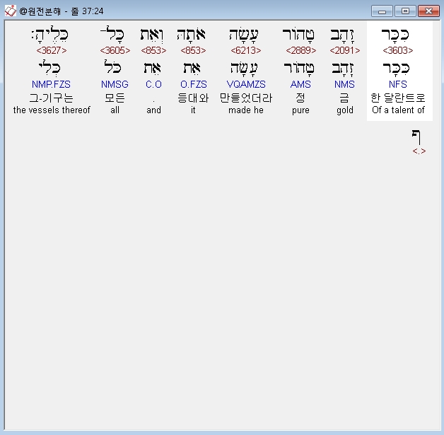 히브리어구약BHS,24 כִּכָּר זָהָב טָהֹור עָשָׂה אֹתָהּ וְאֵת כָּל־כֵּלֶיהָ׃ ף