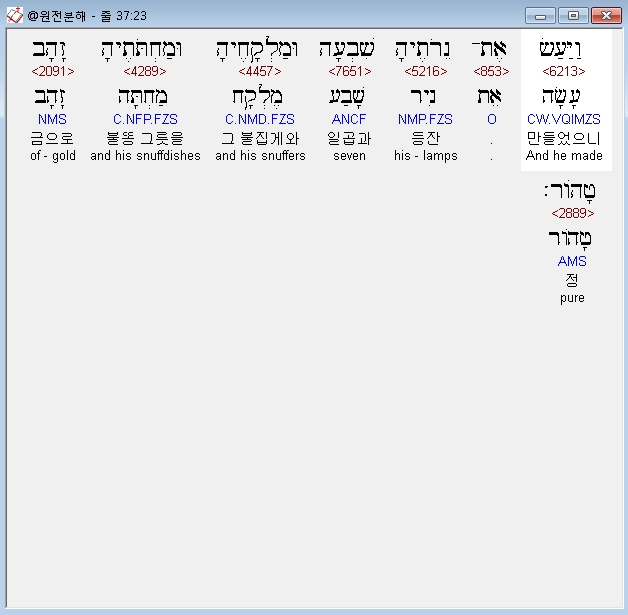 히브리어구약BHS,23 וַיַּעַשׂ אֶת־נֵרֹתֶיהָ שִׁבְעָה וּמַלְקָחֶיהָ וּמַחְתֹּתֶיהָ זָהָב טָהֹור׃