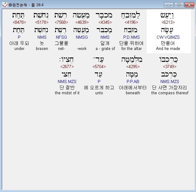 히브리어구약BHS,4 וַיַּעַשׂ לַמִּזְבֵּחַ מִכְבָּר מַעֲשֵׂה רֶשֶׁת נְחֹשֶׁת תַּחַת כַּרְכֻּבֹּו מִלְּמַטָּה עַד־חֶצְיֹו׃