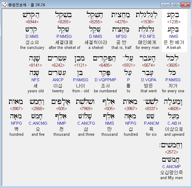 영어NASB,26 a beka a head (that is, half a shekel according to the shekel of the sanctuary), for each one who passed over to those who were numbered, from twenty years old and upward, for 6035500 men.