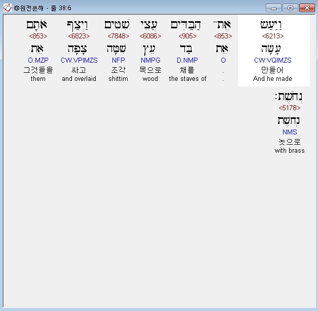 히브리어구약BHS,6 וַיַּעַשׂ אֶת־הַבַּדִּים עֲצֵי שִׁטִּים וַיְצַף אֹתָם נְחֹשֶׁת׃