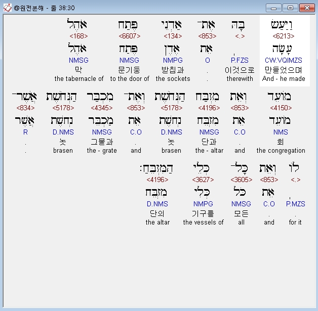 히브리어구약BHS,30 וַיַּעַשׂ בָּהּ אֶת־אַדְנֵי פֶּתַח אֹהֶל מֹועֵד וְאֵת מִזְבַּח הַנְּחֹשֶׁת וְאֶת־מִכְבַּר הַנְּחֹשֶׁת אֲשֶׁר־לֹו וְאֵת כָּל־כְּלֵי הַמִּזְבֵּחַ׃