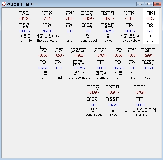 영어NASB,31 and the sockets of the court all around and the sockets of the gate of the court, and all the pegs of the tabernacle and all the pegs of the court all around.
