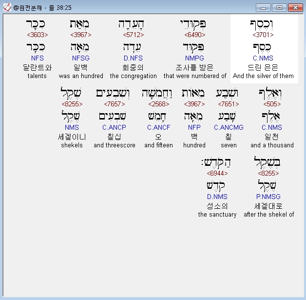 영어NASB,25 And the silver of those of the congregation who were numbered was 100 talents and 17755 shekels, according to the shekel of the sanctuary;