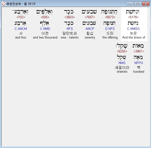 히브리어구약BHS,29 וּנְחֹשֶׁת הַתְּנוּפָה שִׁבְעִים כִּכָּר וְאַלְפַּיִם וְאַרְבַּע־מֵאֹות שָׁקֶל׃