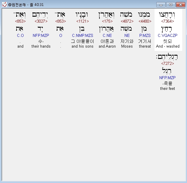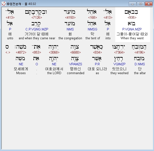 히브리어구약BHS,32 בְּבֹאָם אֶל־אֹהֶל מֹועֵד וּבְקָרְבָתָם אֶל־הַמִּזְבֵּחַ יִרְחָצוּ כַּאֲשֶׁר צִוָּה יְהוָה אֶת־מֹשֶׁה׃ ס