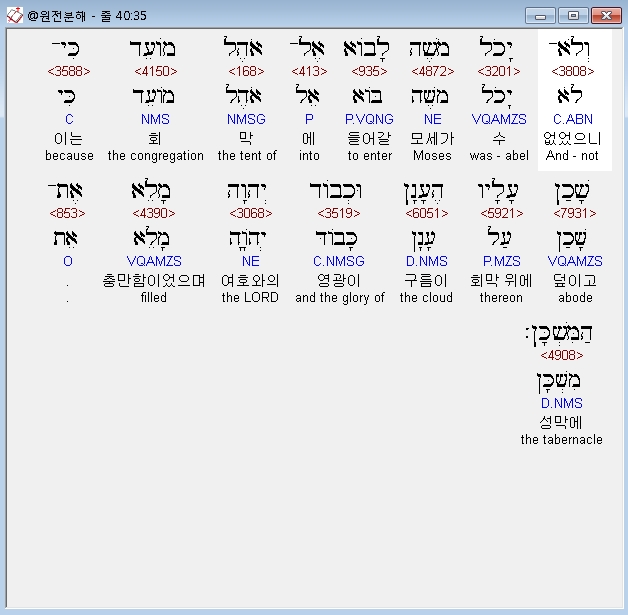 히브리어구약BHS,35 וְלֹא־יָכֹל מֹשֶׁה לָבֹוא אֶל־אֹהֶל מֹועֵד כִּי־שָׁכַן עָלָיו הֶעָןָן וּכְבֹוד יְהוָה מָלֵא אֶת־הַמִּשְׁכָּן׃