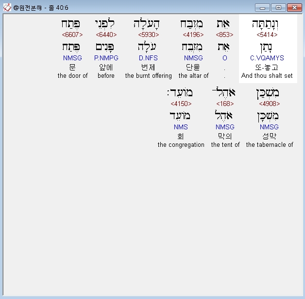 히브리어구약BHS,6 וְנָתַתָּה אֵת מִזְבַּח הָעֹלָה לִפְנֵי פֶּתַח מִשְׁכַּן אֹהֶל־מֹועֵד׃