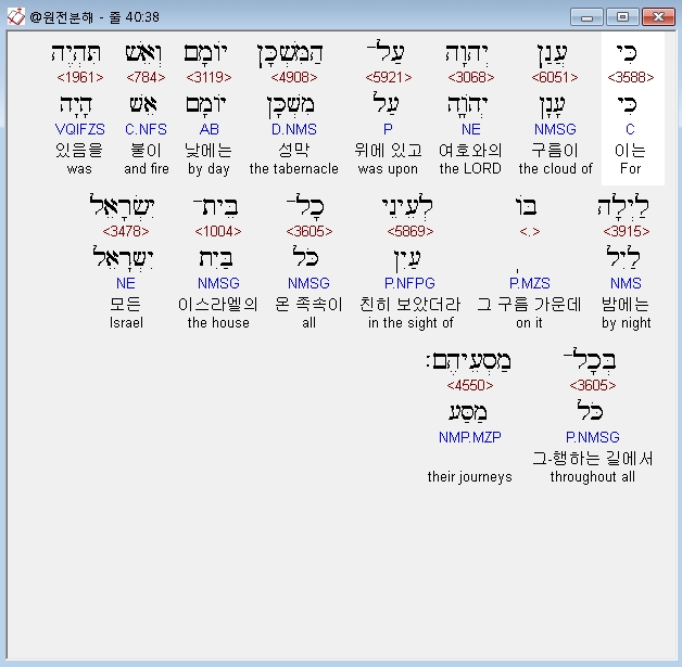 히브리어구약BHS,38 כִּי עֲןַן יְהוָה עַל־הַמִּשְׁכָּן יֹוםָם וְאֵשׁ תִּהְיֶה לַיְלָה בֹּו לְעֵינֵי כָל־בֵּית־יִשְׂרָאֵל בְּכָל־מַסְעֵיהֶם׃