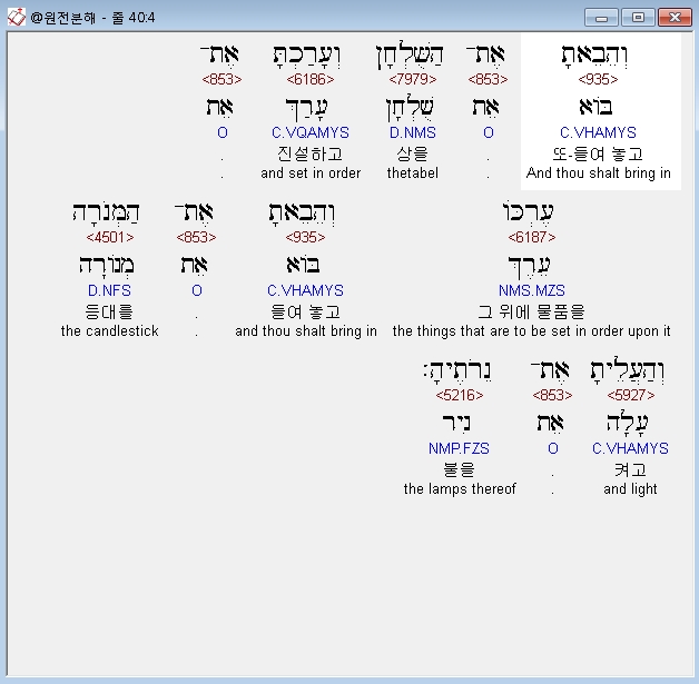 히브리어구약BHS,4 וְהֵבֵאתָ אֶת־הַשֻּׁלְחָן וְעָרַכְתָּ אֶת־עֶרְכֹּו וְהֵבֵאתָ אֶת־הַמְּנֹרָה וְהַעֲלֵיתָ אֶת־נֵרֹתֶיהָ׃
