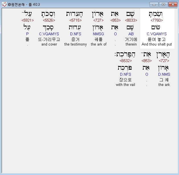히브리어구약BHS,3 וְשַׂמְתָּ שָׁם אֵת אֲרֹון הָעֵדוּת וְסַכֹּתָ עַל־הָאָרֹן אֶת־הַפָּרֹכֶת׃