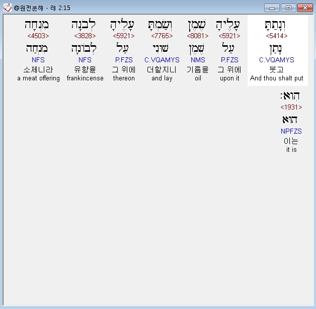 히브리어구약BHS,15 וְנָתַתָּ עָלֶיהָ שֶׁמֶן וְשַׂמְתָּ עָלֶיהָ לְבֹנָה מִנְחָה הִוא׃