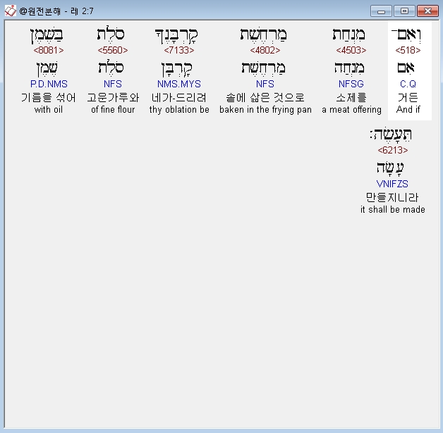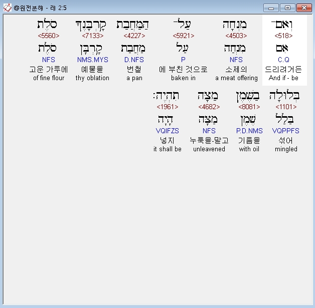 히브리어구약BHS,5 וְאִם־מִנְחָה עַל־הַמַּחֲבַת קָרְבָּנֶךָ סֹלֶת בְּלוּלָה בַשֶּׁמֶן מַצָּה תִהְיֶה׃