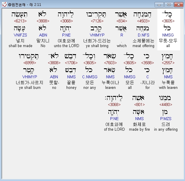 히브리어구약BHS,11 כָּל־הַמִּנְחָה אֲשֶׁר תַּקְרִיבוּ לַיהוָה לֹא תֵעָשֶׂה חָמֵץ כִּי כָל־שְׂאֹר וְכָל־דְּבַשׁ לֹא־תַקְטִירוּ מִמֶּנּוּ אִשֶּׁה לַיהוָה׃