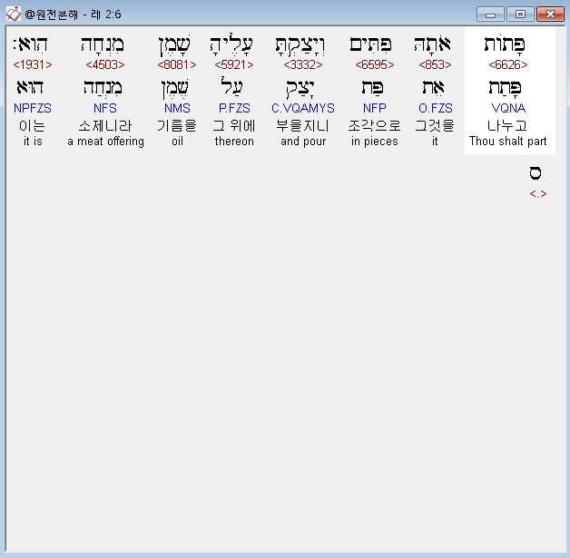 히브리어구약BHS,6 פָּתֹות אֹתָהּ פִּתִּים וְיָצַקְתָּ עָלֶיהָ שָׁמֶן מִנְחָה הִוא׃ ס