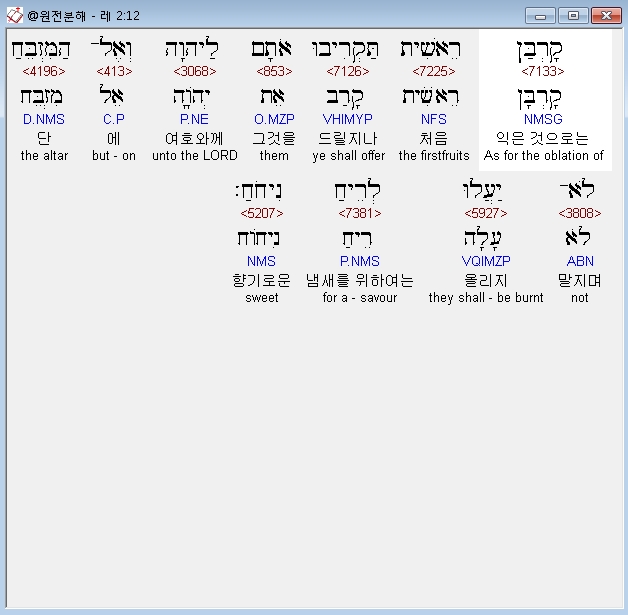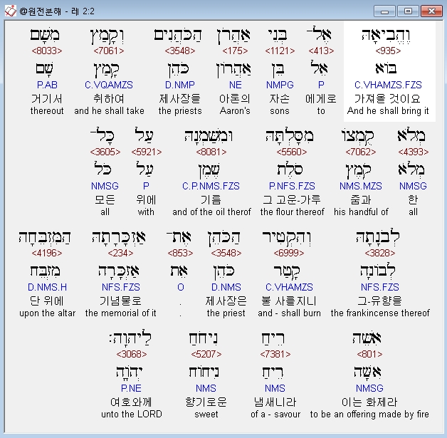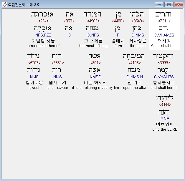 히브리어구약BHS,2 וֶהֱבִיאָהּ אֶל־בְּנֵי אַהֲרֹן הַכֹּהֲנִים וְקָמַץ מִשָּׁם מְלֹא קֻמְצֹו מִסָּלְתָּהּ וּמִשַּׁמְנָהּ עַל כָּל־לְבֹנָתָהּ וְהִקְטִיר הַכֹּהֵן אֶת־אַזְכָּרָתָהּ הַמִּזְבֵּחָה אִשֵּׁה רֵיחַ נִיחֹחַ לַיהוָה׃