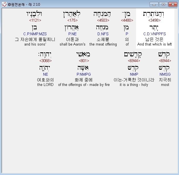 히브리어구약BHS,10 וְהַנֹּותֶרֶת מִן־הַמִּנְחָה לְאַהֲרֹן וּלְבָנָיו קֹדֶשׁ קָדָשִׁים מֵאִשֵּׁי יְהוָה׃