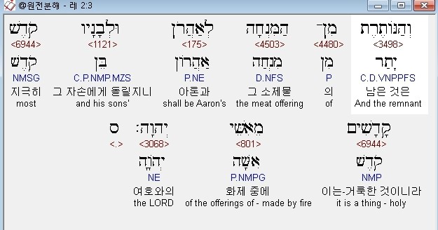 히브리어구약BHS,3 וְהַנֹּותֶרֶת מִן־הַמִּנְחָה לְאַהֲרֹן וּלְבָנָיו קֹדֶשׁ קָדָשִׁים מֵאִשֵּׁי יְהוָה׃ ס