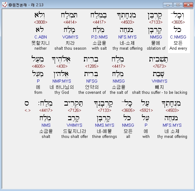 히브리어구약BHS,13 וְכָל־קָרְבַּן מִנְחָתְךָ בַּמֶּלַח תִּמְלָח וְלֹא תַשְׁבִּית מֶלַח בְּרִית אֱלֹהֶיךָ מֵעַל מִנְחָתֶךָ עַל כָּל־קָרְבָּנְךָ תַּקְרִיב מֶלַח׃ ס