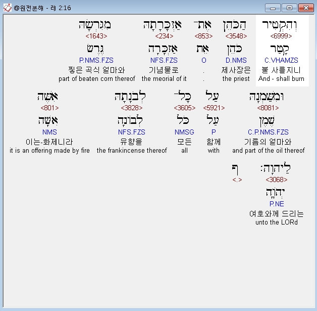 히브리어구약BHS,16 וְהִקְטִיר הַכֹּהֵן אֶת־אַזְכָּרָתָהּ מִגִּרְשָׂהּ וּמִשַּׁמְנָהּ עַל כָּל־לְבֹנָתָהּ אִשֶּׁה לַיהוָה׃ ף