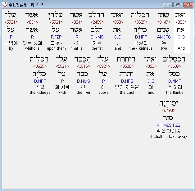 히브리어구약BHS,15 וְאֵת שְׁתֵּי הַכְּלָיֹת וְאֶת־הַחֵלֶב אֲשֶׁר עֲלֵהֶן אֲשֶׁר עַל־הַכְּסָלִים וְאֶת־הַיֹּתֶרֶת עַל־הַכָּבֵד עַל־הַכְּלָיֹת יְסִירֶנָּה׃