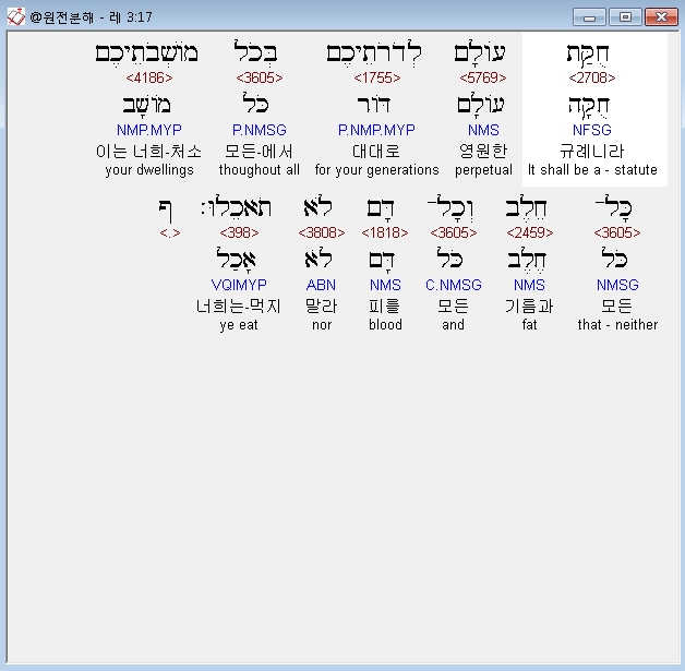 헬라어구약Septuagint,17 νομιμον εις τον αιωνα εις τας γενεας υμων εν παση κατοικια υμων παν στεαρ και παν αιμα ουκ εδεσθε