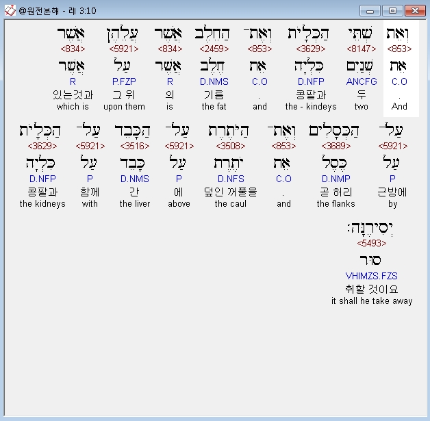 히브리어구약BHS,4 וְאֵת שְׁתֵּי הַכְּלָיֹת וְאֶת־הַחֵלֶב אֲשֶׁר עֲלֵהֶן אֲשֶׁר עַל־הַכְּסָלִים וְאֶת־הַיֹּתֶרֶת עַל־הַכָּבֵד עַל־הַכְּלָיֹות יְסִירֶנָּה׃