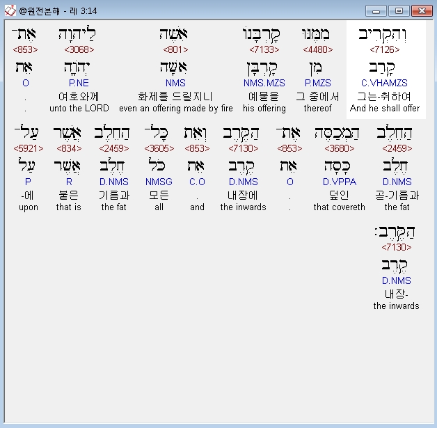 히브리어구약BHS,14 וְהִקְרִיב מִמֶּנּוּ קָרְבָּנֹו אִשֶּׁה לַיהוָה אֶת־הַחֵלֶב הַמְכַסֶּה אֶת־הַקֶּרֶב וְאֵת כָּל־הַחֵלֶב אֲשֶׁר עַל־הַקֶּרֶב׃