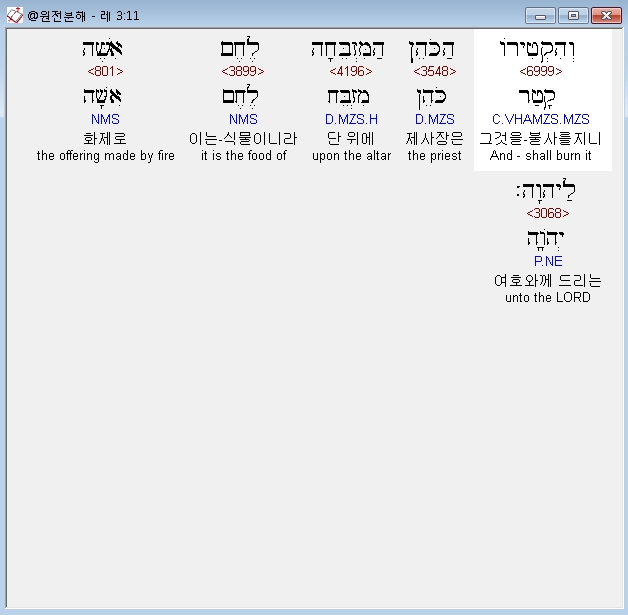 히브리어구약BHS,11 וְהִקְטִירֹו הַכֹּהֵן הַמִּזְבֵּחָה לֶחֶם אִשֶּׁה לַיהוָה׃ ף