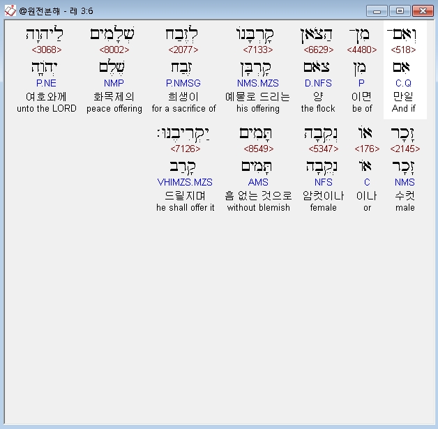 히브리어구약BHS,6 וְאִם־מִן־הַצֹּאן קָרְבָּנֹו לְזֶבַח שְׁלָמִים לַיהוָה זָכָר אֹו נְקֵבָה תָּמִים יַקְרִיבֶנּוּ׃