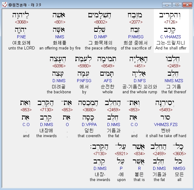 히브리어구약BHS,3 וְהִקְרִיב מִזֶּבַח הַשְּׁלָמִים אִשֶּׁה לַיהוָה אֶת־הַחֵלֶב הַמְכַסֶּה אֶת־הַקֶּרֶב וְאֵת כָּל־הַחֵלֶב אֲשֶׁר עַל־הַקֶּרֶב׃