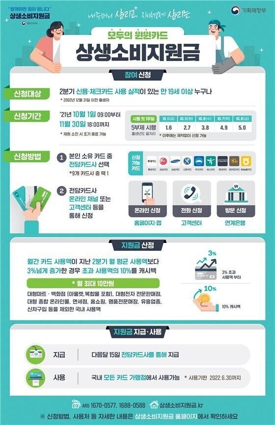 10-11월 두 달간 한시적으로 시행하며 1인당 월 10만원까지 최대 20만원을 환급받을 수 있습니다.