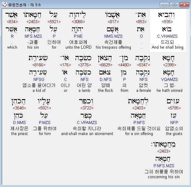 히브리어구약BHS,6 וְהֵבִיא אֶת־אֲשָׁמֹו לַיהוָה עַל חַטָּאתֹו אֲשֶׁר חָטָא נְקֵבָה מִן־הַצֹּאן כִּשְׂבָּה אֹו־שְׂעִירַת עִזִּים לְחַטָּאת וְכִפֶּר עָלָיו הַכֹּהֵן מֵחַטָּאתֹו׃
