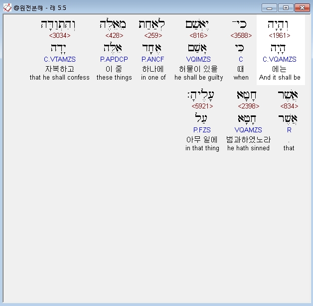 히브리어구약BHS,5 וְהָיָה כִי־יֶאְשַׁם לְאַחַת מֵאֵלֶּה וְהִתְוַדָּה אֲשֶׁר חָטָא עָלֶיהָ׃