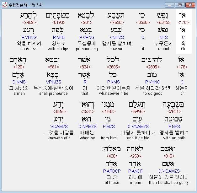 헬라어구약Septuagint,4 η ψυχη η αν ομοση διαστελλουσα τοις χειλεσιν κακοποιησαι η καλως ποιησαι κατα παντα οσα εαν διαστειλη ο ανθρωπος μεθ' ορκου και λαθη αυτον προ οφθαλμων και ουτος γνω και αμαρτη εν τι τουτων