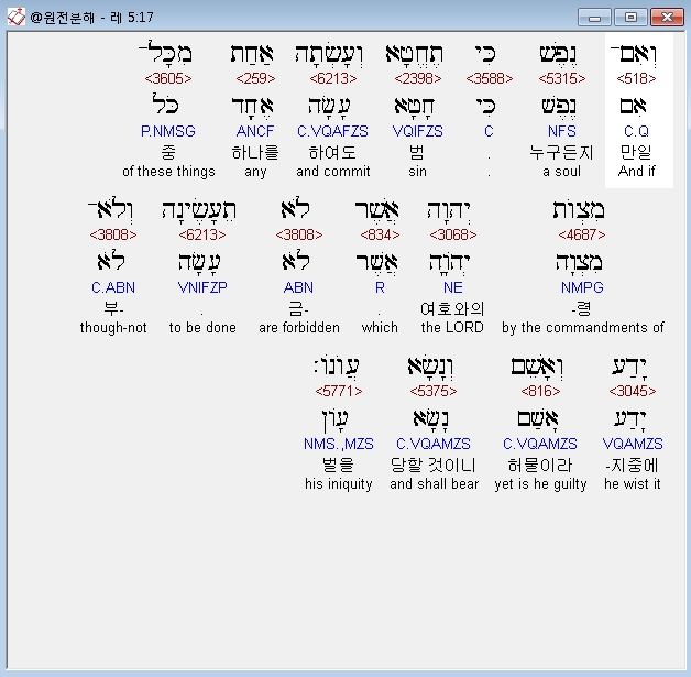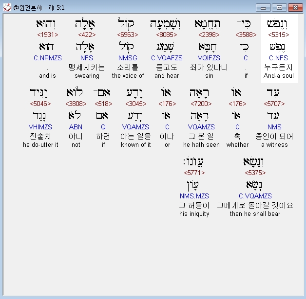 히브리어구약BHS,1 וְנֶפֶשׁ כִּי־תֶחֱטָא וְשָׁמְעָה קֹול אָלָה וְהוּא עֵד אֹו רָאָה אֹו יָדָע אִם־לֹוא יַגִּיד וְנָשָׂא עֲוֹנֹו׃