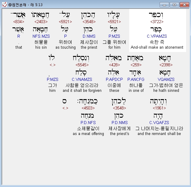 속한즉...사함을 얻으리라 - 여기서 '속한즉'(*,키페르) 기본 동사 '카파르'(*)는 '덮다'(cover) '무효로 하다'(disannul)란 뜻으로서, 곧 '속죄'란 희생제사의 제물로서 하나님의 진노를 덮어 그 진노를 무효화시키는 행위임을 알 수 있다. 그리고 '사함을 얻으리라'에 해당하는 '니셀라흐'(*)는 '용서하다'(forgive,pardon,spare)란 뜻의 '살라흐'(*)에서 파생된 말로서, 곧 희생제사의 제물로써 범죄자의 죄는 분명 용서함 받을 것이라는 의미이다.