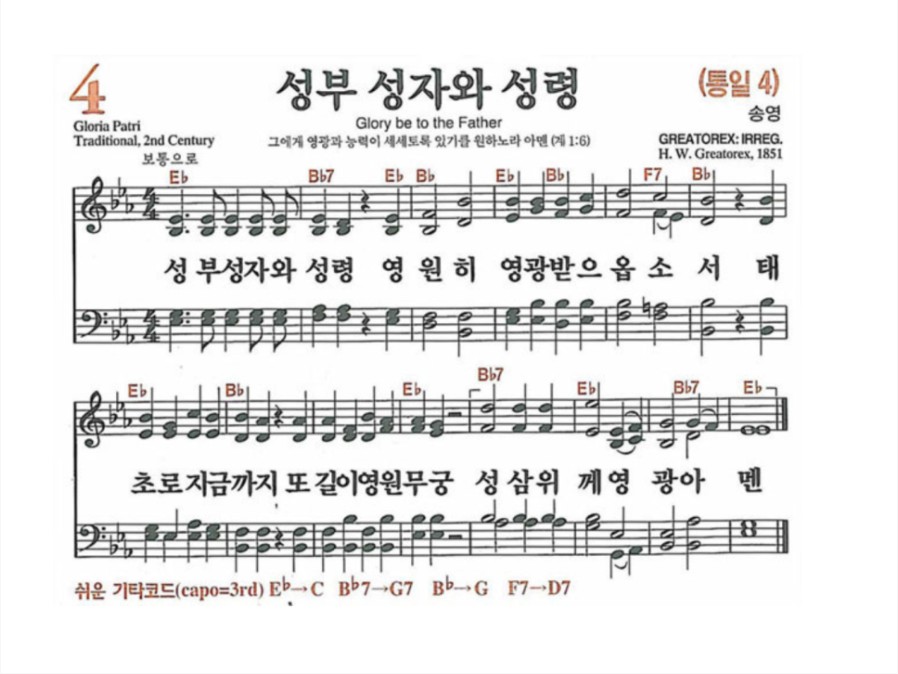 성부 성자와 성령 영원히 영광 받으옵소서 태초로 지금까지 또 영원무궁토록 성 삼위께 영광 아멘