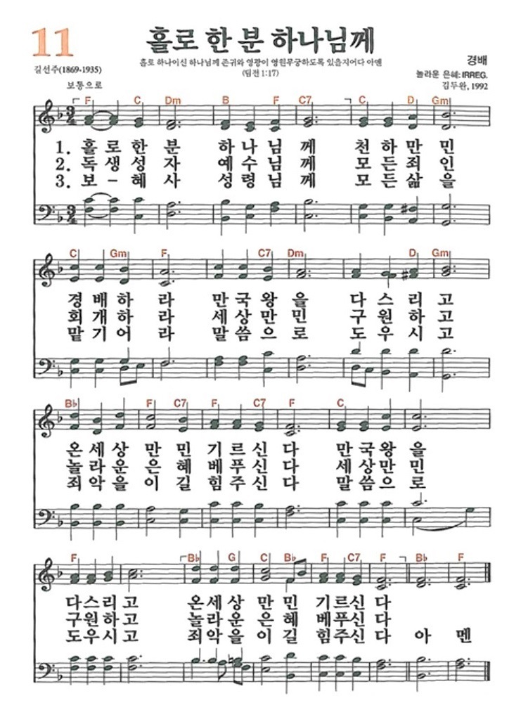 새찬송가 11장 홀로 한 분 하나님께-악보 PPT(배경X) 11 홀로 한 분 하나님께 경배 F 3/4 11장 | 홀로 한 분 하나님께 | 경배 1. 홀로 한 분 하나님께 천하 만민 경배하라 만국왕을 다스리고 온 세상 만