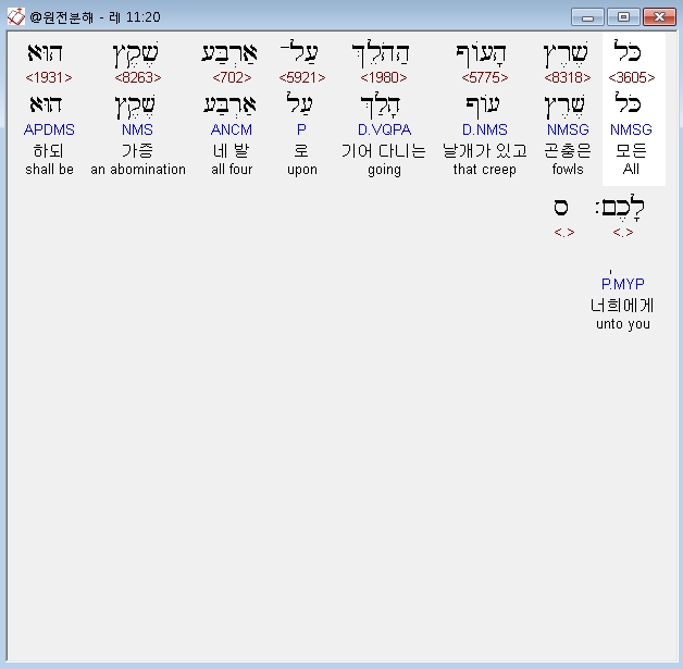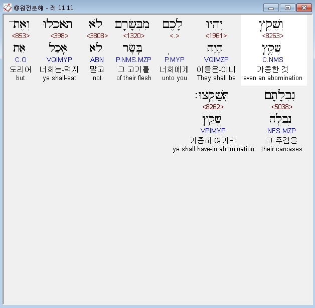헬라어구약Septuagint,43 και ου μη βδελυξητε τας ψυχας υμων εν πασι τοις ερπετοις τοις ερπουσιν επι της γης και ου μιανθησεσθε εν τουτοις και ουκ ακαθαρτοι εσεσθε εν αυτοις