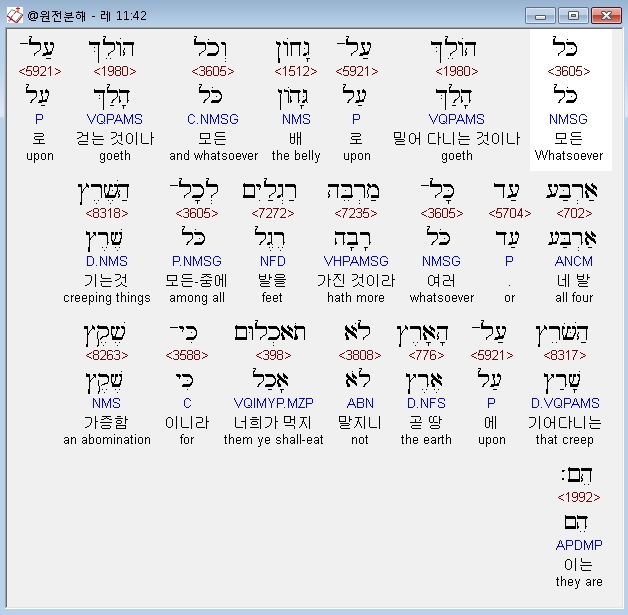 헬라어구약Septuagint,42 και πας ο πορευομενος επι κοιλιας και πας ο πορευομενος επι τεσσαρα δια παντος ο πολυπληθει ποσιν εν πασιν τοις ερπετοις τοις ερπουσιν επι της γης ου φαγεσθε αυτο οτι βδελυγμα υμιν εστιν