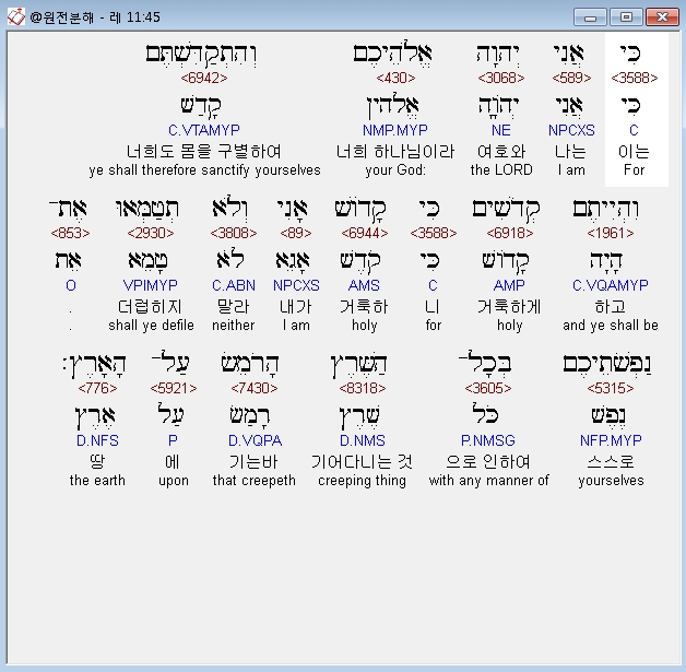 히브리어구약BHS,44 כִּי אֲנִי יְהוָה אֱלֹהֵיכֶם וְהִתְקַדִּשְׁתֶּם וִהְיִיתֶם קְדֹשִׁים כִּי קָדֹושׁ אָנִי וְלֹא תְטַמְּאוּ אֶת־נַפְשֹׁתֵיכֶם בְּכָל־הַשֶּׁרֶץ הָרֹמֵשׂ עַל־הָאָרֶץ׃