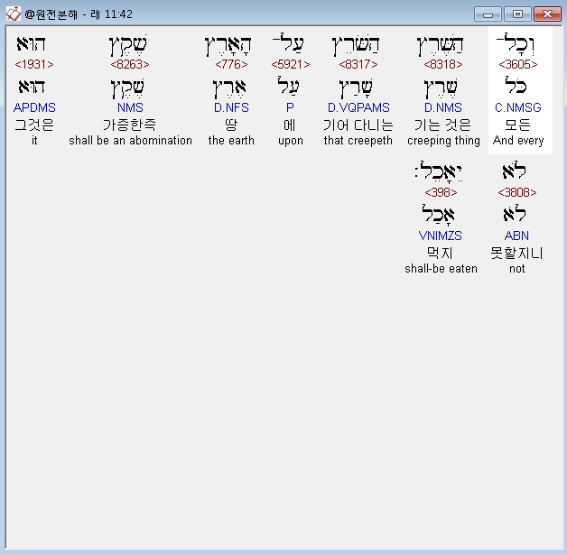 히브리어구약BHS,41 וְכָל־הַשֶּׁרֶץ הַשֹּׁרֵץ עַל־הָאָרֶץ שֶׁקֶץ הוּא לֹא יֵאָכֵל׃