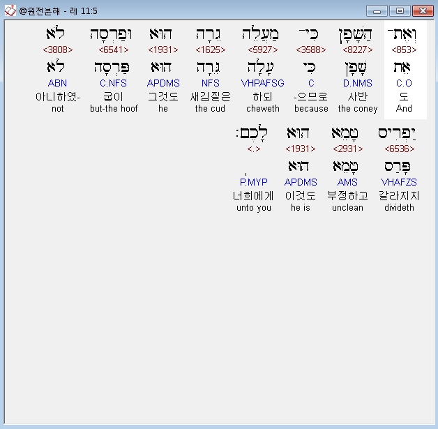 히브리어구약BHS,5 וְאֶת־הַשָּׁפָן כִּי־מַעֲלֵה גֵרָה הוּא וּפַרְסָה לֹא יַפְרִיס טָמֵא הוּא לָכֶם׃
