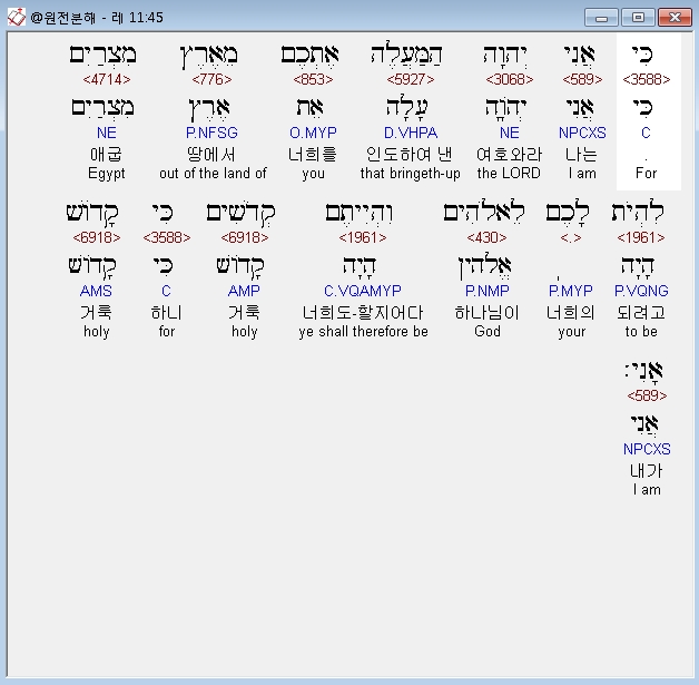 영어NASB,45 'For I am the LORD, who brought you up from the land of Egypt, to be your God; thus you shall be holy for I am holy.' "