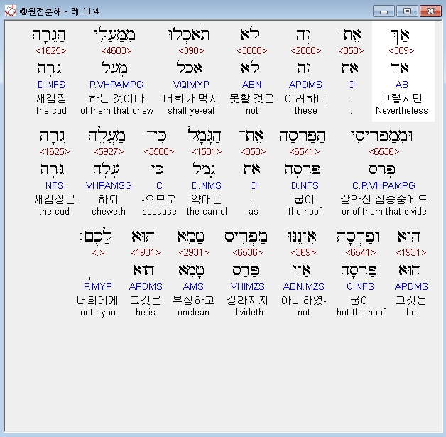 히브리어구약BHS,4 אַךְ אֶת־זֶה לֹא תֹאכְלוּ מִמַּעֲלֵי הַגֵּרָה וּמִמַּפְרִיסֵי הַפַּרְסָה אֶת־הַגָּמָל כִּי־מַעֲלֵה גֵרָה הוּא וּפַרְסָה אֵינֶנּוּ מַפְרִיס טָמֵא הוּא לָכֶם׃