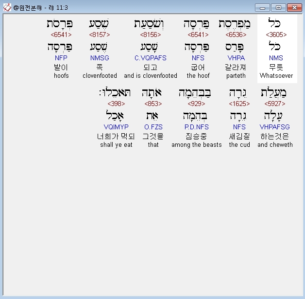 히브리어구약BHS,3 כֹּל מַפְרֶסֶת פַּרְסָה וְשֹׁסַעַת שֶׁסַע פְּרָסֹת מַעֲלַת גֵּרָה בַּבְּהֵמָה אֹתָהּ תֹּאכֵלוּ׃