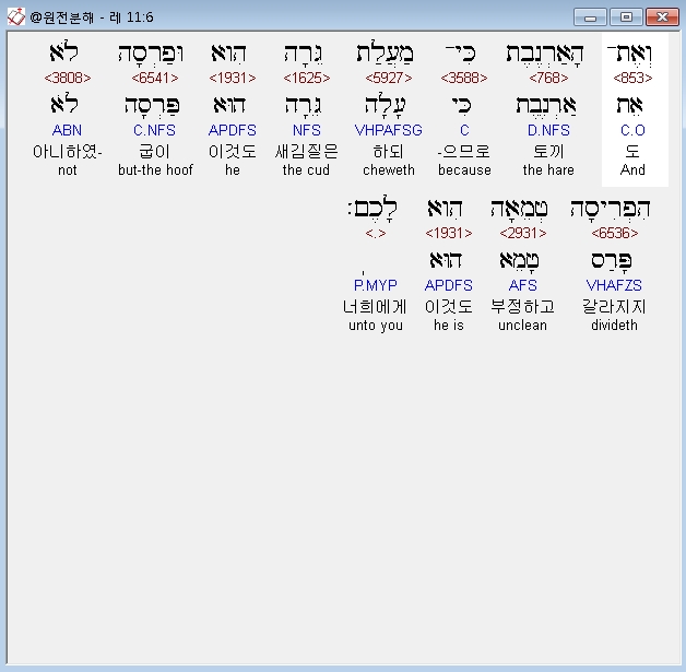 히브리어구약BHS,6 וְאֶת־הָאַרְנֶבֶת כִּי־מַעֲלַת גֵּרָה הִוא וּפַרְסָה לֹא הִפְרִיסָה טְמֵאָה הִוא לָכֶם׃
